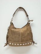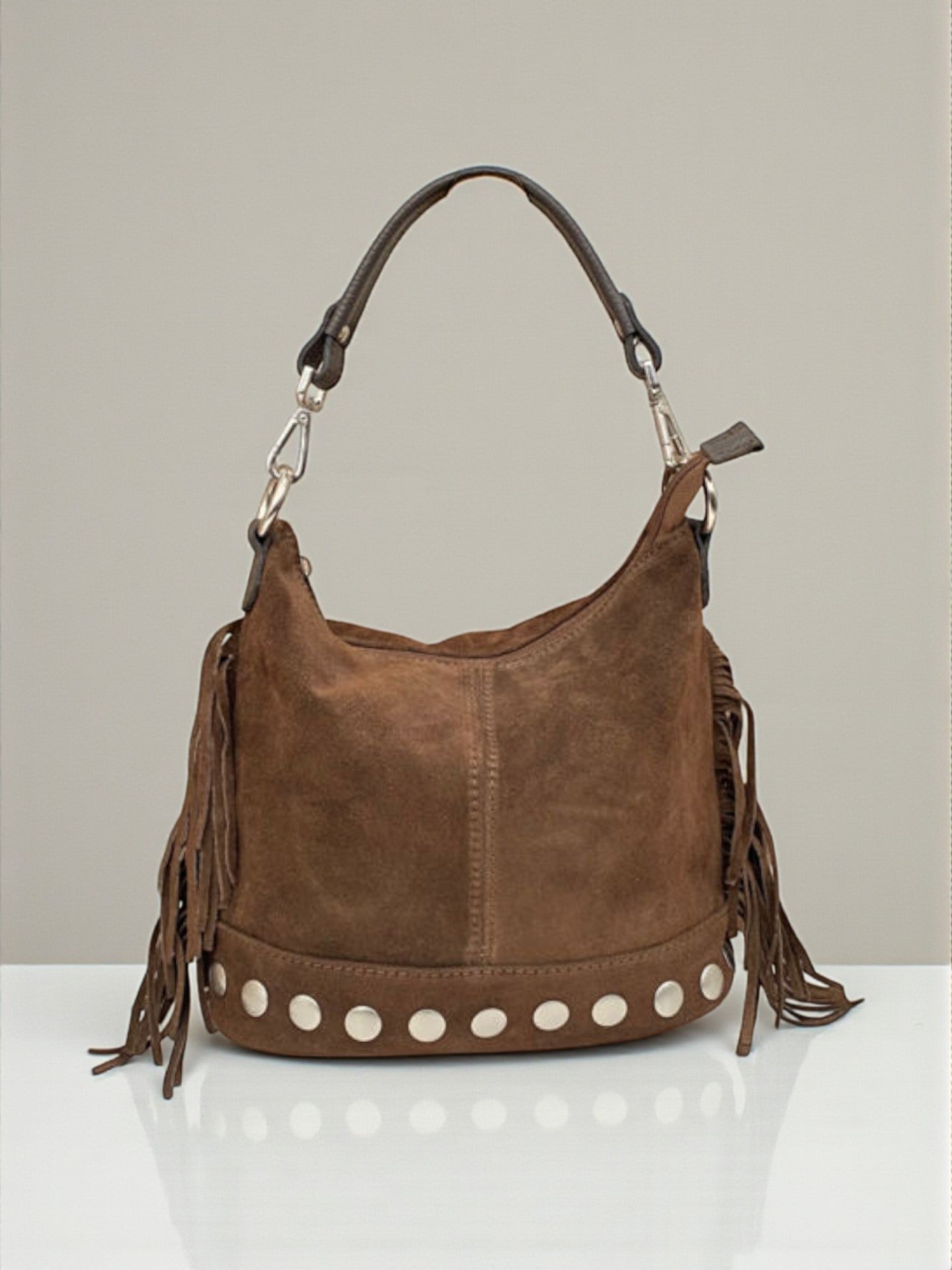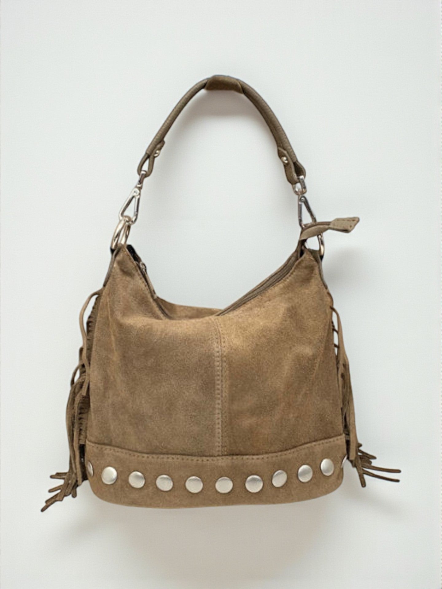Bolso tipo hobo confeccionado en acabado ante, disponible en color taupe o marrón. Diseño amplio con cierre de cremallera, flecos laterales y aplicaciones metálicas en la base. Asa desmontable con herrajes plateados que aportan un toque moderno. Un modelo versátil y cómodo, perfecto para completar looks casuales o de inspiración boho.