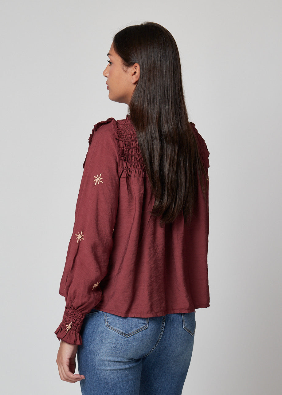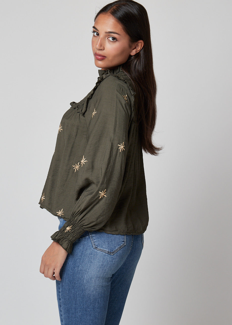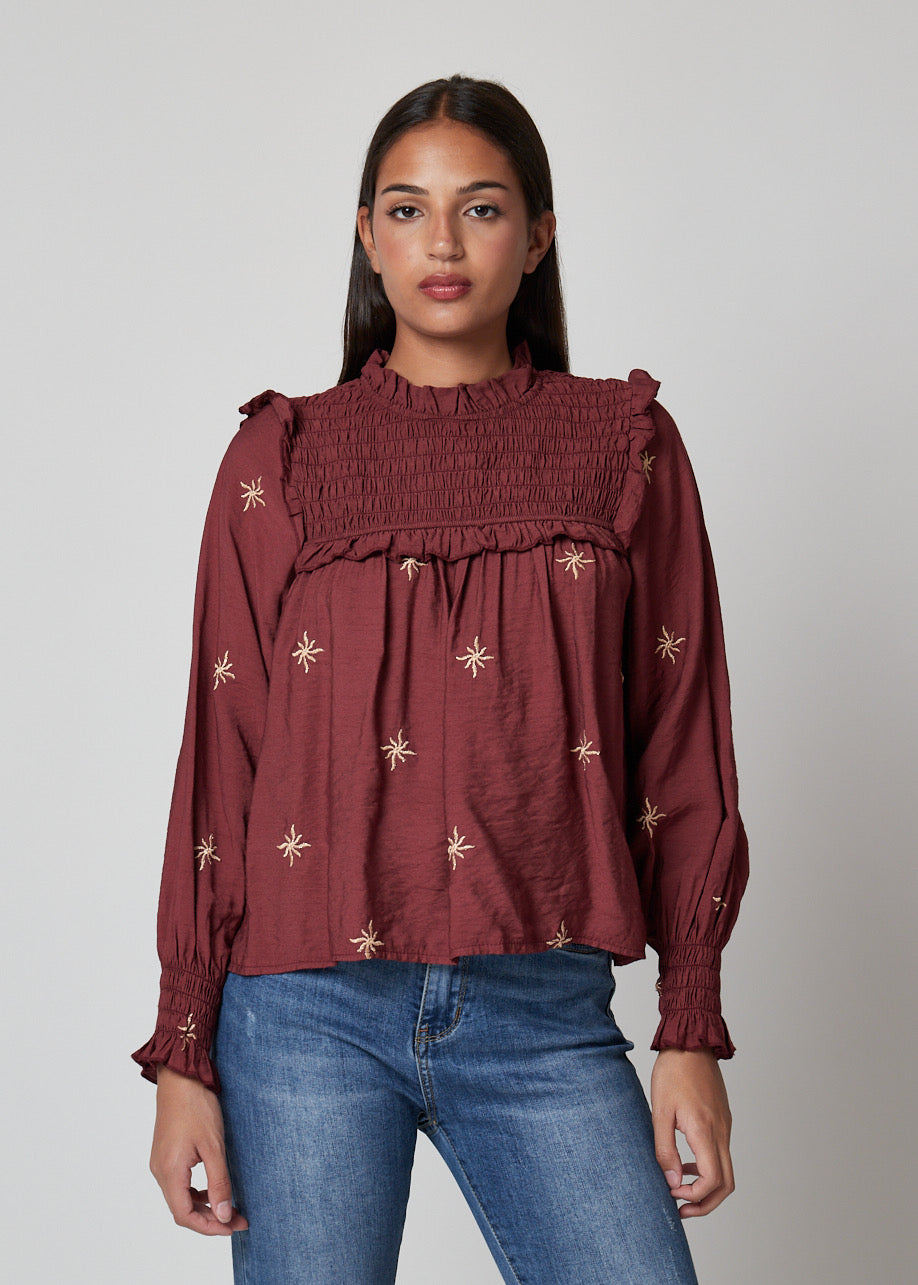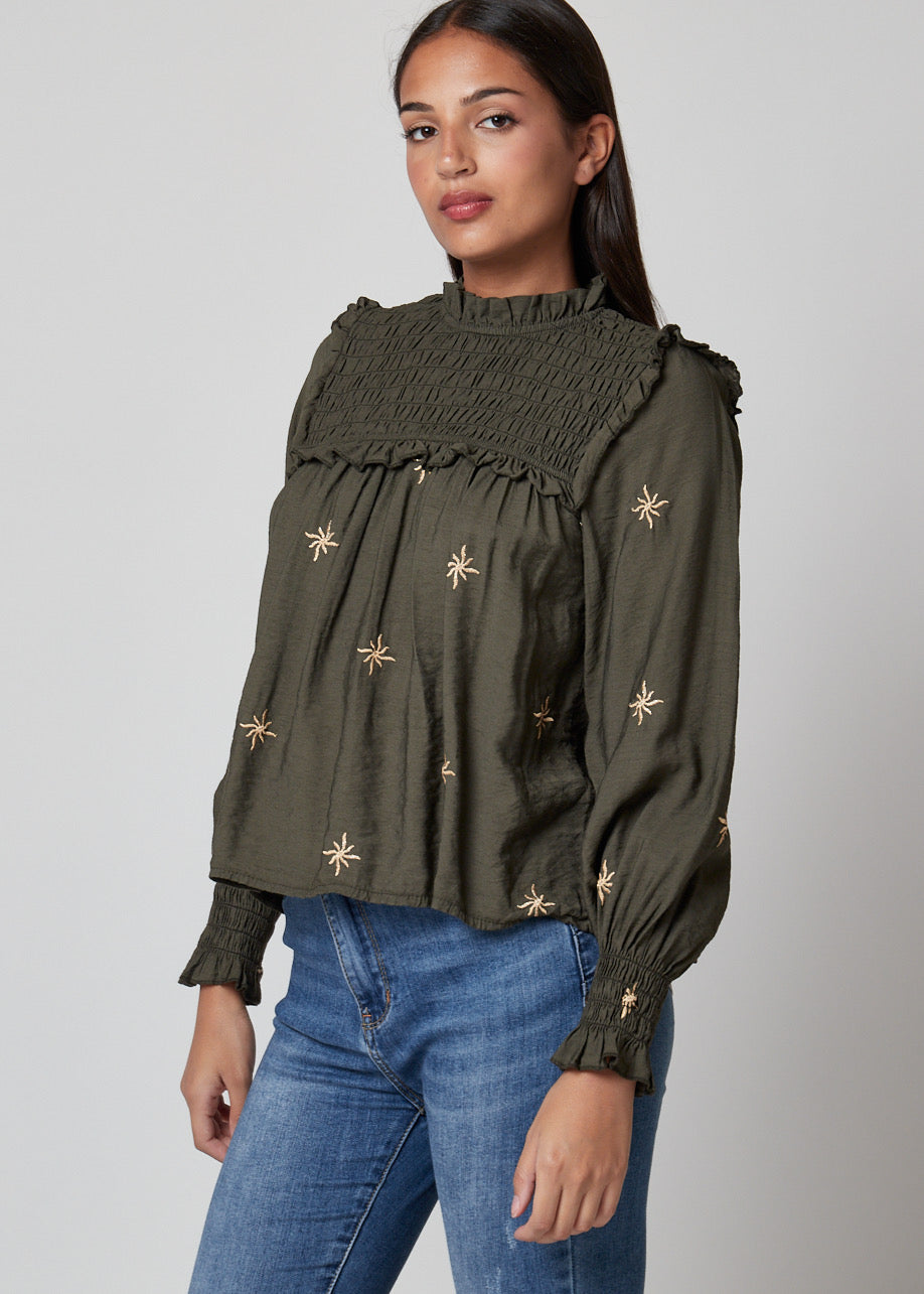 Blusa fluida con bordados decorativos en tono dorado y diseño fruncido en el pecho. Presenta cuello alto con volantes, mangas abullonadas con puños elásticos y acabado suave con caída natural. Disponible en verde oliva y burdeos, perfecta para combinar con jeans o pantalones de vestir.