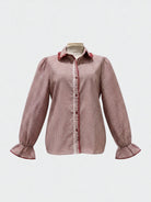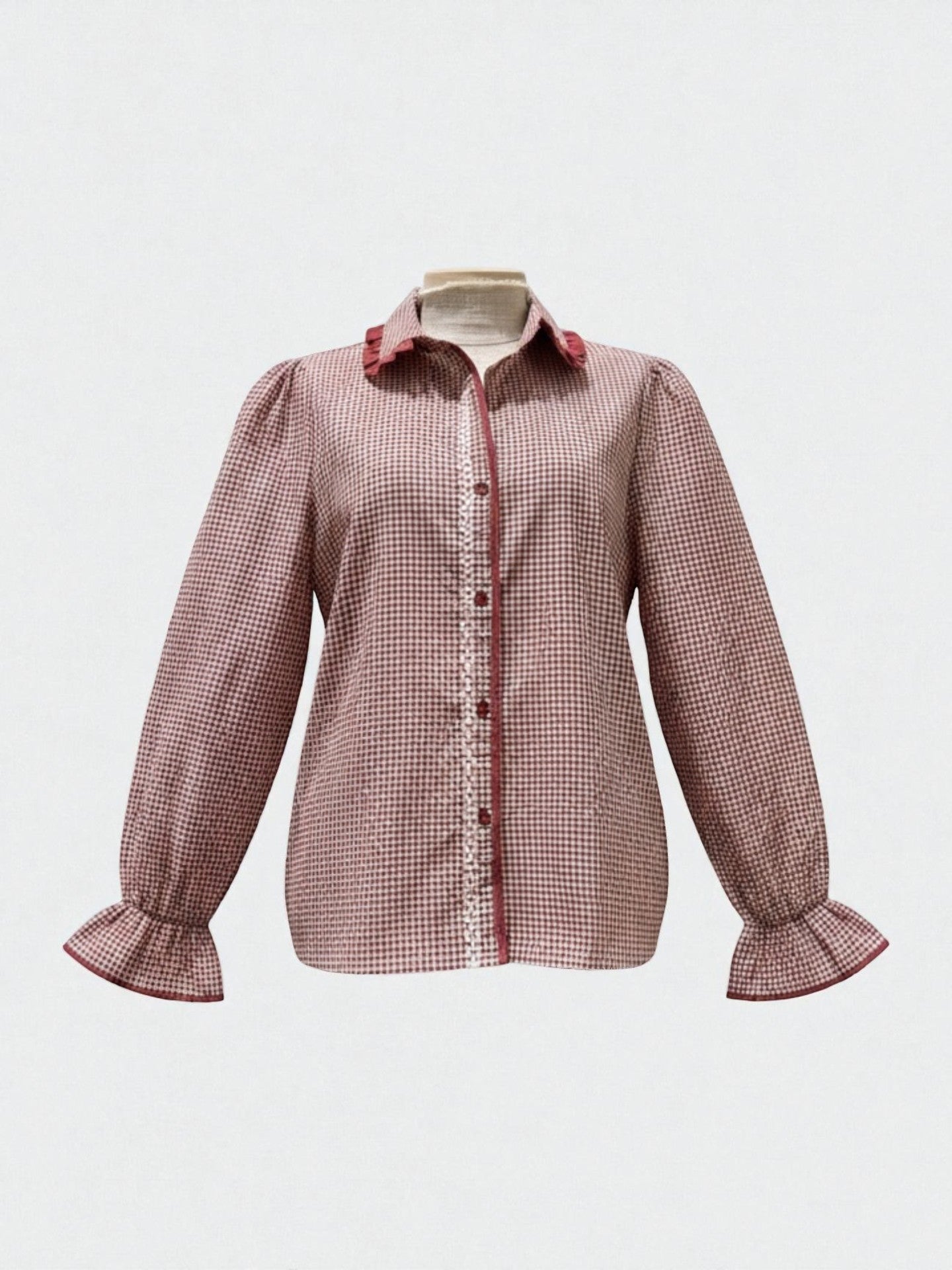 Blusa de cuadros vichy en tonos burdeos y beige con detalles románticos. Cuello camisero con volante, cierre de botones y vivo a contraste. Mangas largas con puños acampanados, ideal para un look femenino con aire vintage.