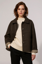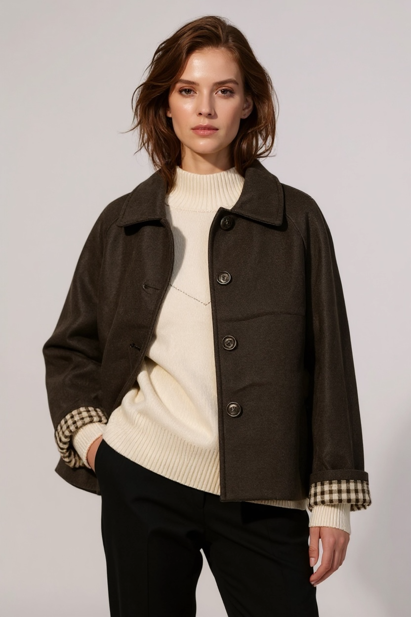Chaqueta corta en color marrón con botones delanteros y cuello clásico. Detalle de vuelta en los puños con estampado de cuadros, ideal para un toque casual y elegante. Perfecta para combinar con vaqueros o pantalones de pinzas en entretiempo.