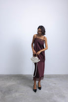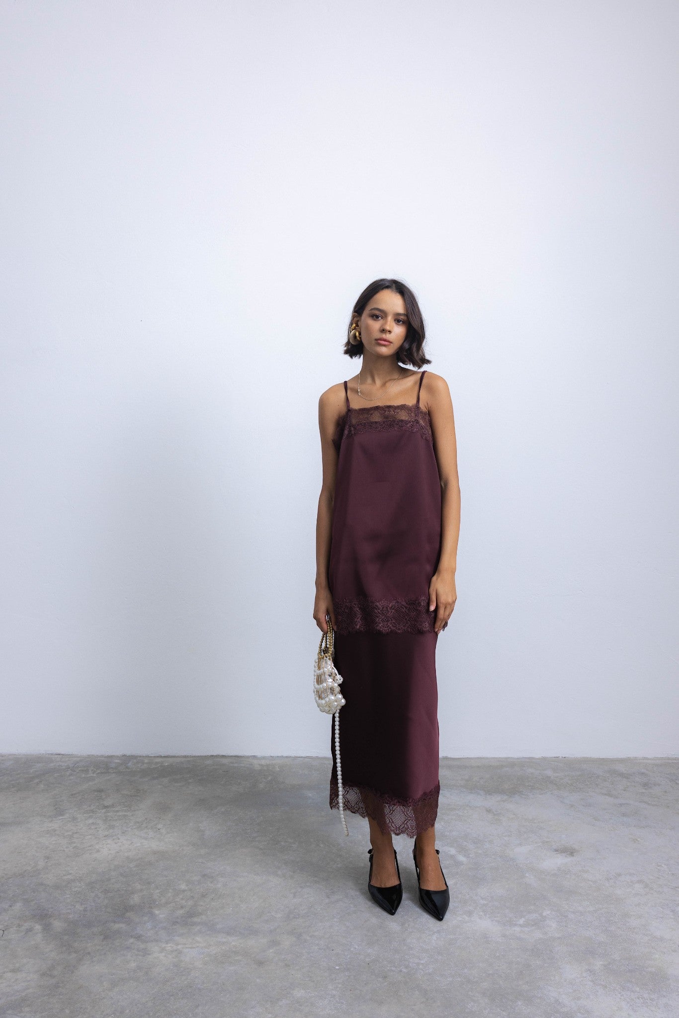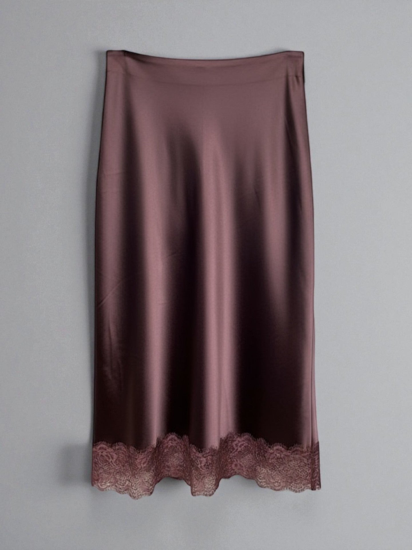 Falda satinada midi en color burdeos con detalle de encaje en el bajo. Diseño fluido y elegante con acabado brillante que aporta movimiento y sofisticación. Cintura lisa y corte recto favorecedor. Ideal para looks de noche o combinada con punto para un estilo más casual.