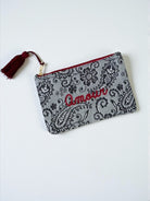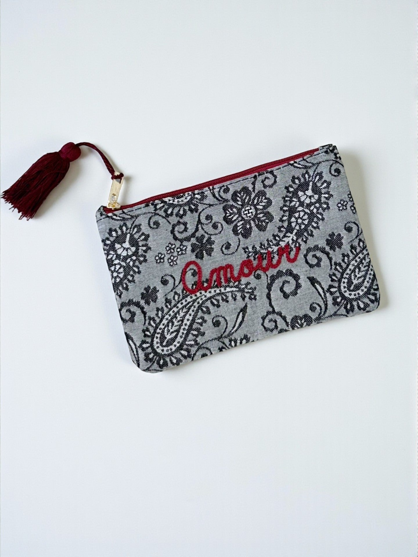 Neceser con estampado paisley en tonos negros sobre fondo gris y bordado “Amour” en hilo burdeos. Cierre superior con cremallera y borla decorativa a juego. Diseño elegante y funcional, perfecto para maquillaje o accesorios de viaje.