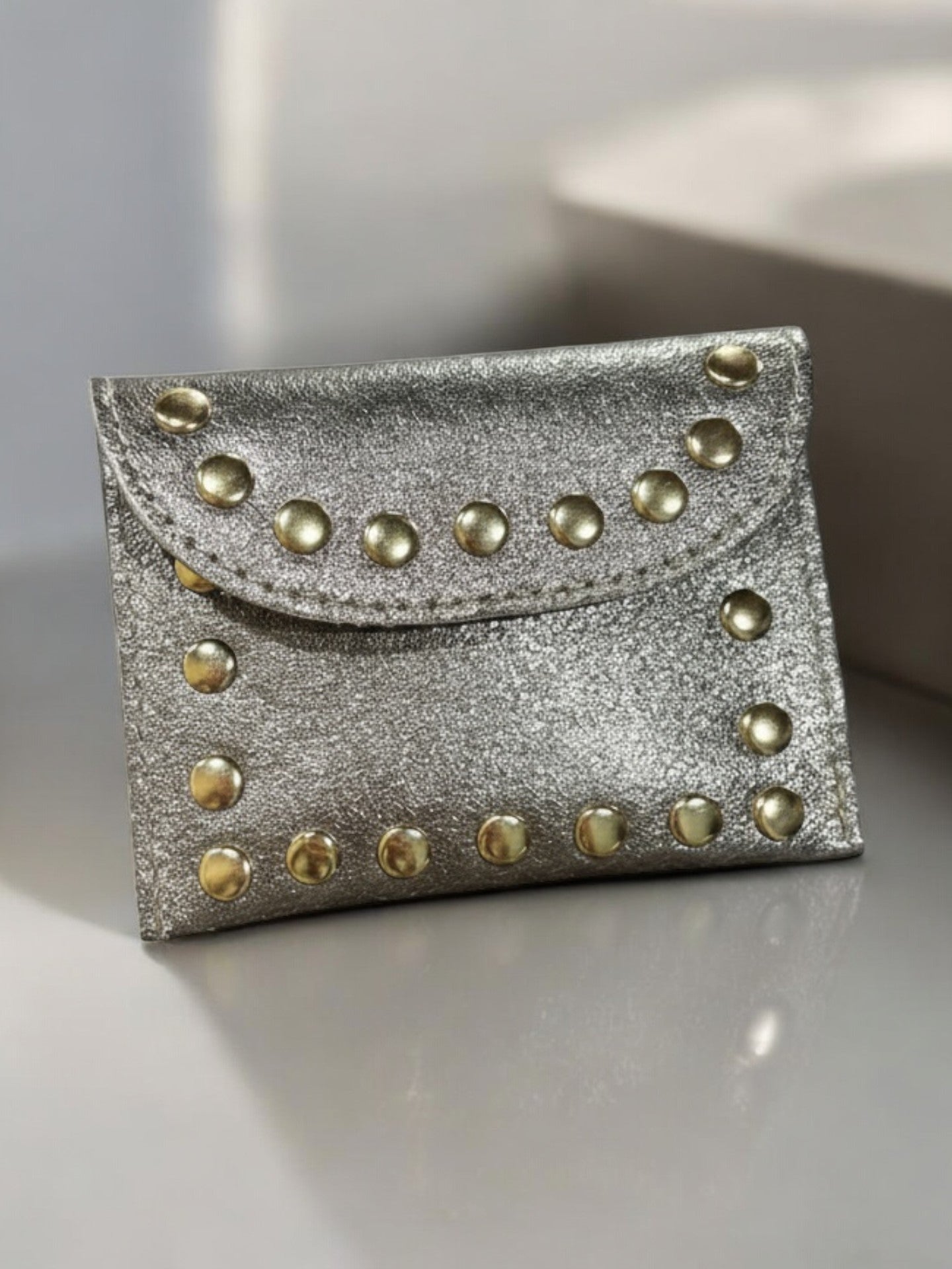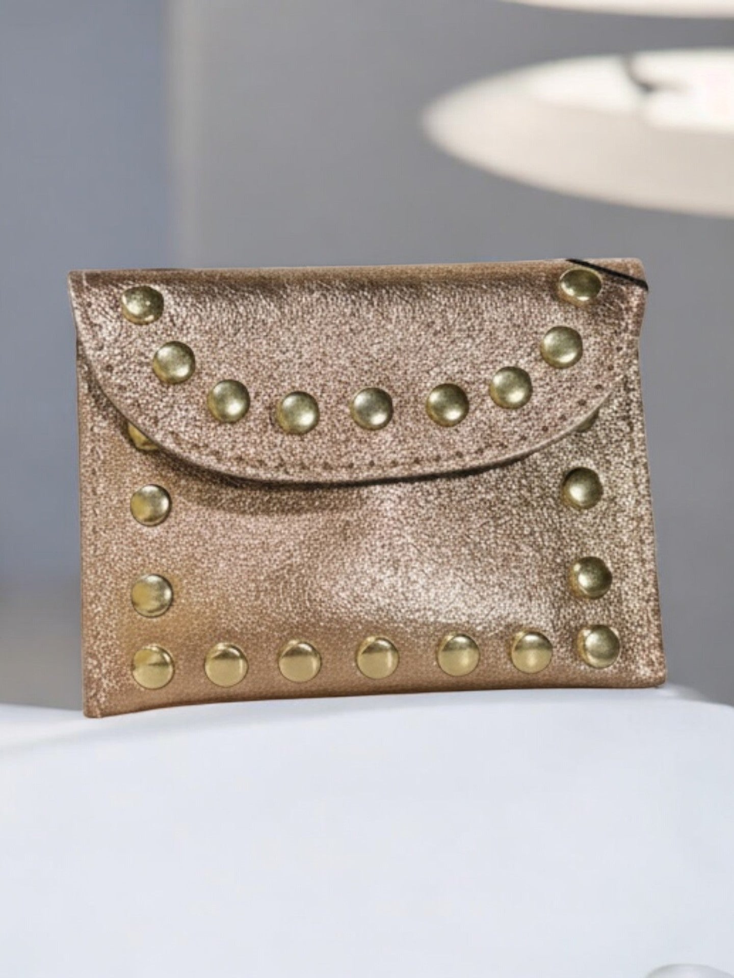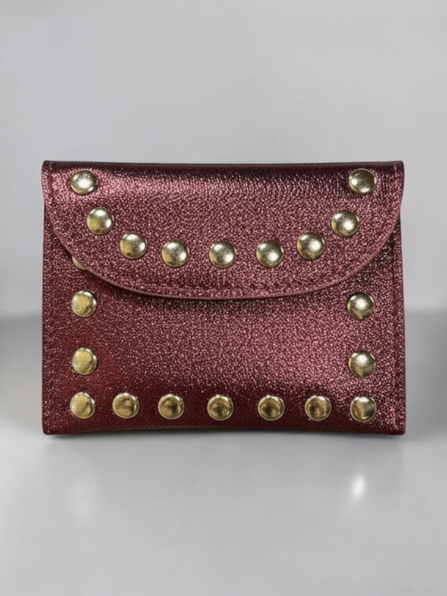 Monederos 100 % piel con tachuelas metálicas doradas. Diseño tipo sobre con cierre a presión y detalles brillantes que aportan un toque moderno y elegante. Disponibles en tonos plata, burdeos, dorado, cobre y topo. Compactos, resistentes y con acabado texturizado ideal para uso diario.