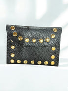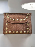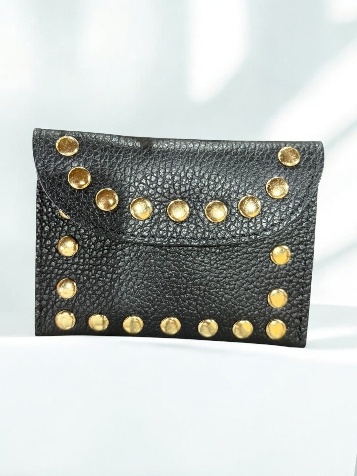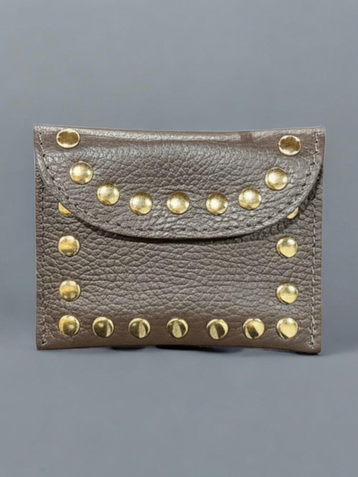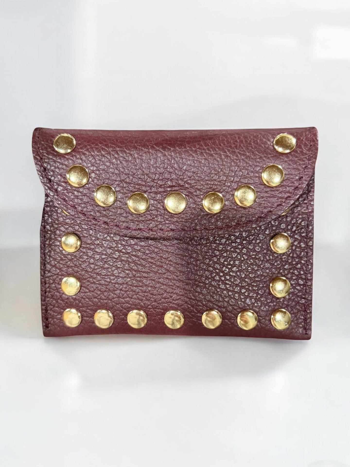 Monederos 100 % piel con tachuelas metálicas doradas. Diseño tipo sobre con cierre a presión y detalles brillantes que aportan un toque moderno y elegante. Disponibles en tonos plata, burdeos, dorado, cobre y topo. Compactos, resistentes y con acabado texturizado ideal para uso diario.