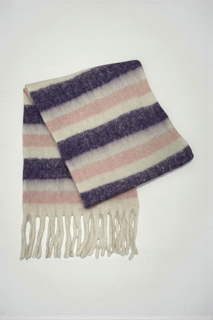 Bufanda de rayas anchas en tonos morado, rosa y beige con flecos en los extremos. Tejido suave y cálido, ideal para los días fríos. Aporta un toque de color y estilo a cualquier look de invierno, combinando fácilmente con abrigos y chaquetas.
