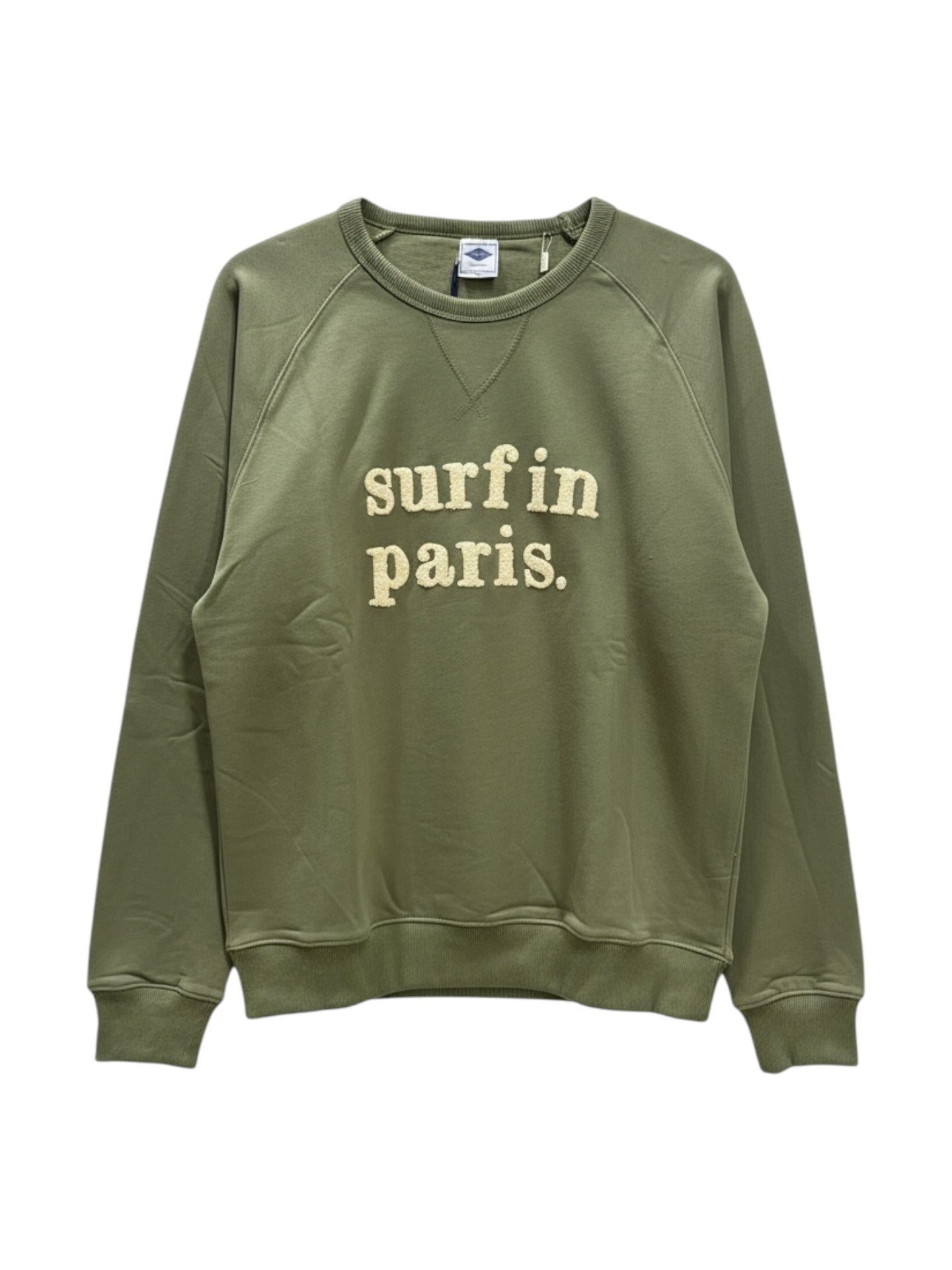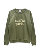 Sudadera de algodón en color verde oliva con texto bordado “Surfin Paris.” en relieve. Diseño de cuello redondo y acabado ajustado en puños y bajo. Estilo urbano y cómodo para el día a día.