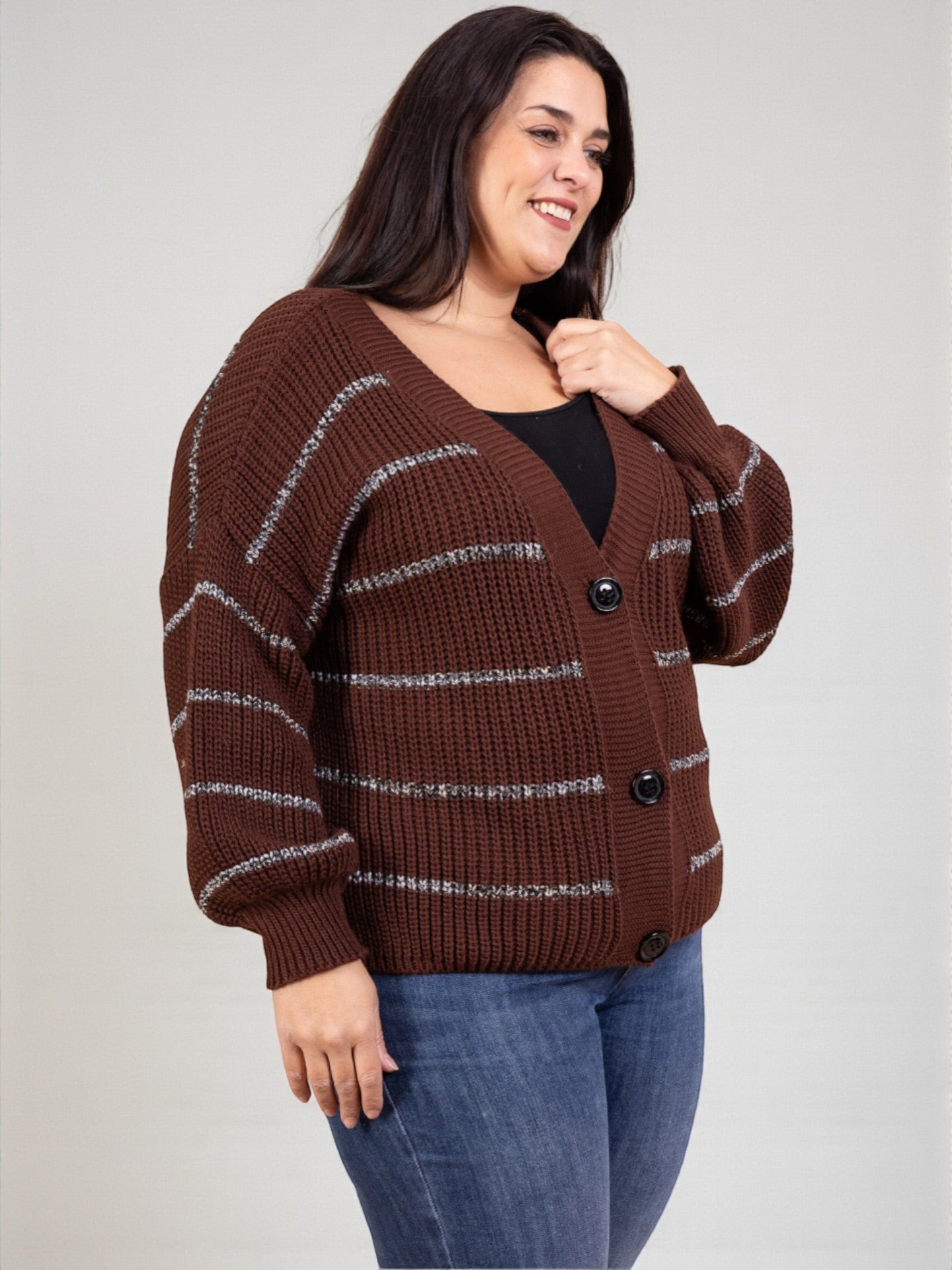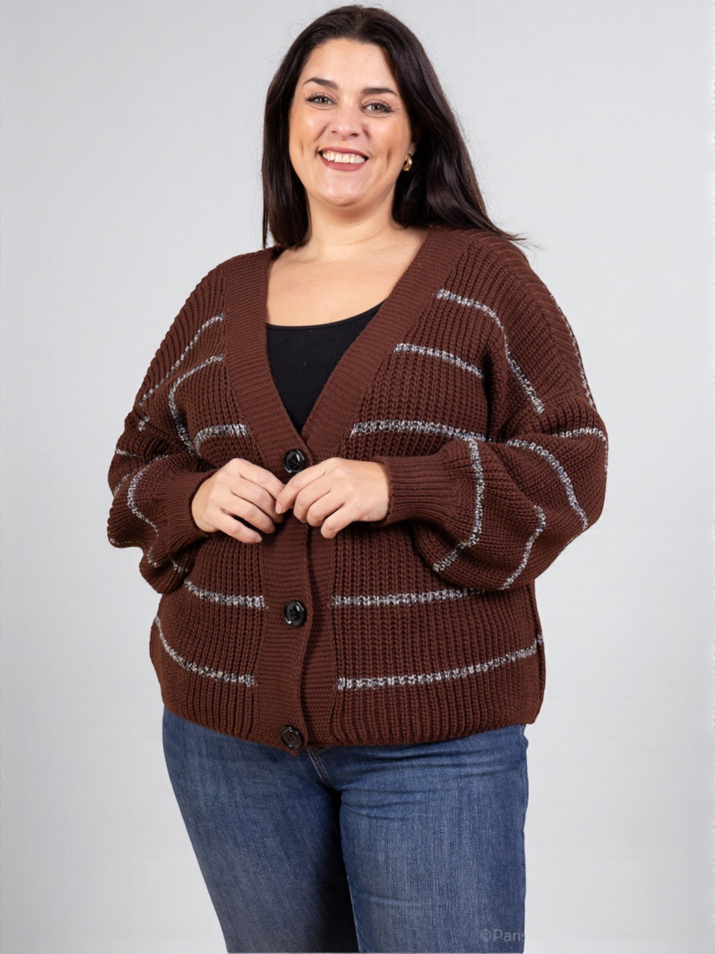 Cárdigan de punto grueso en tono marrón con finas franjas grises. Diseño relajado con escote en “V” y cierre de botones delanteros. Su tejido suave y cálido aporta confort sin renunciar al estilo. Ideal para combinar con básicos y crear looks casuales de entretiempo.
