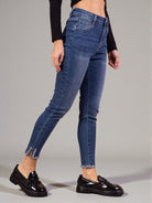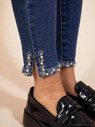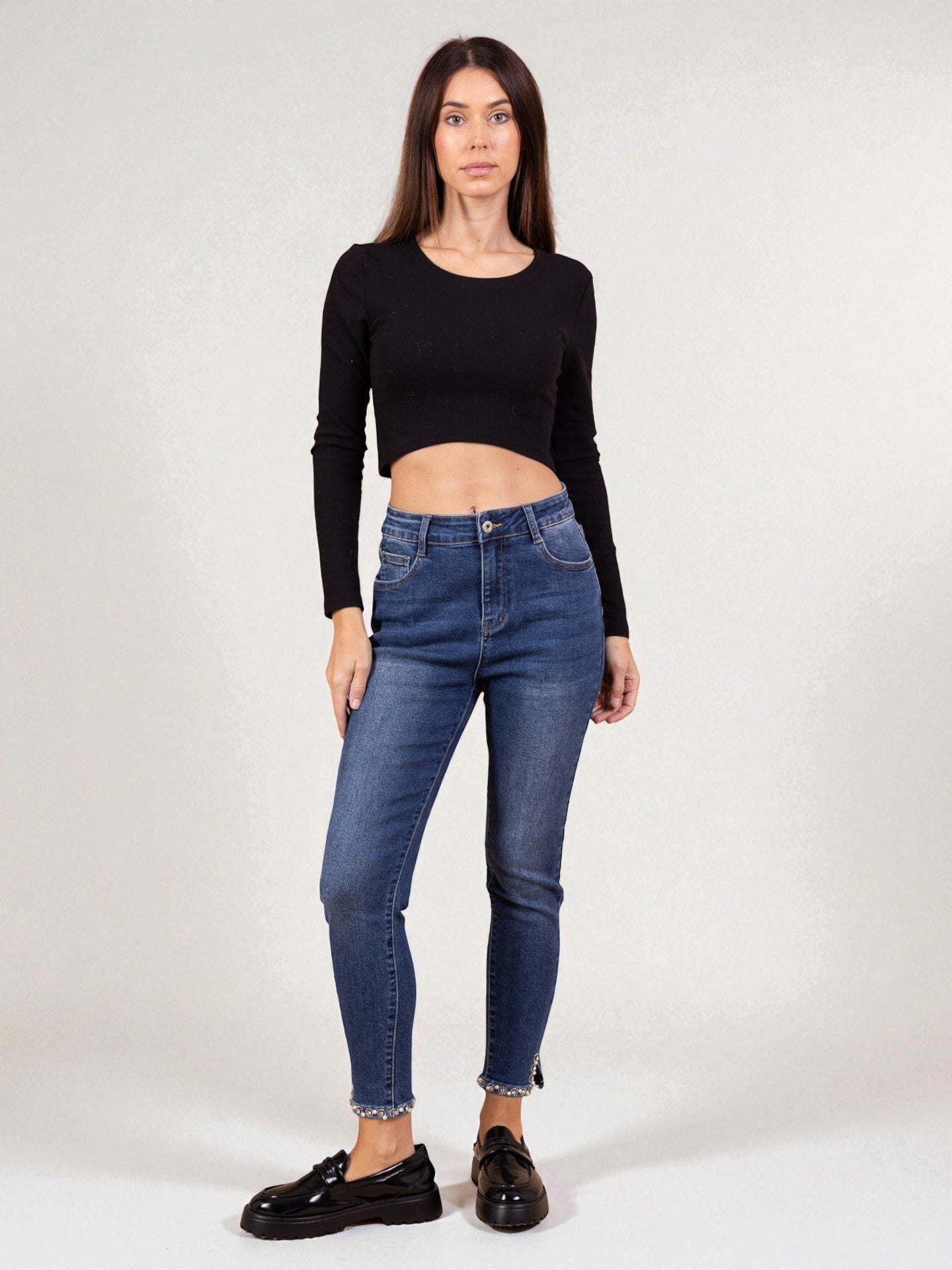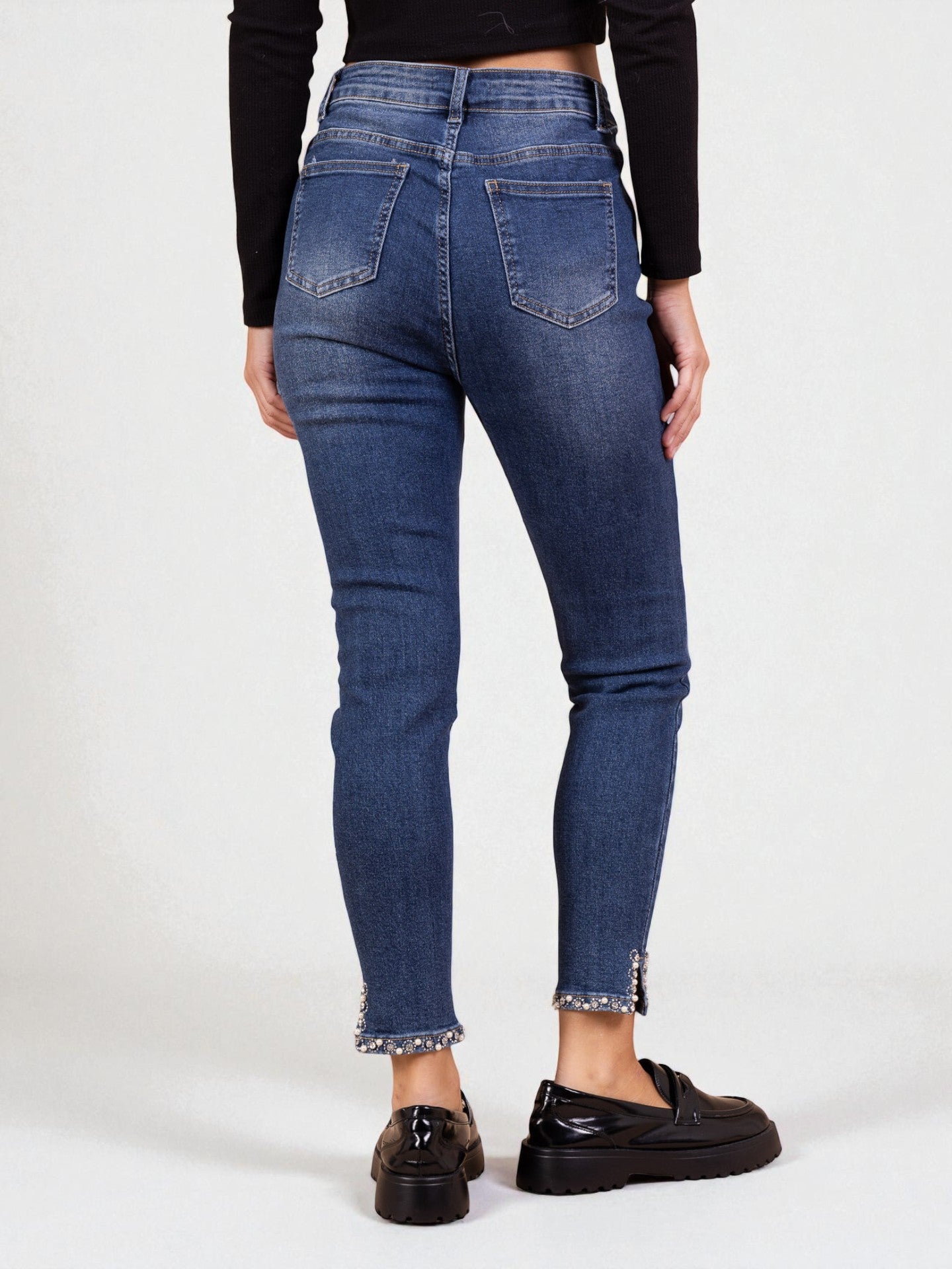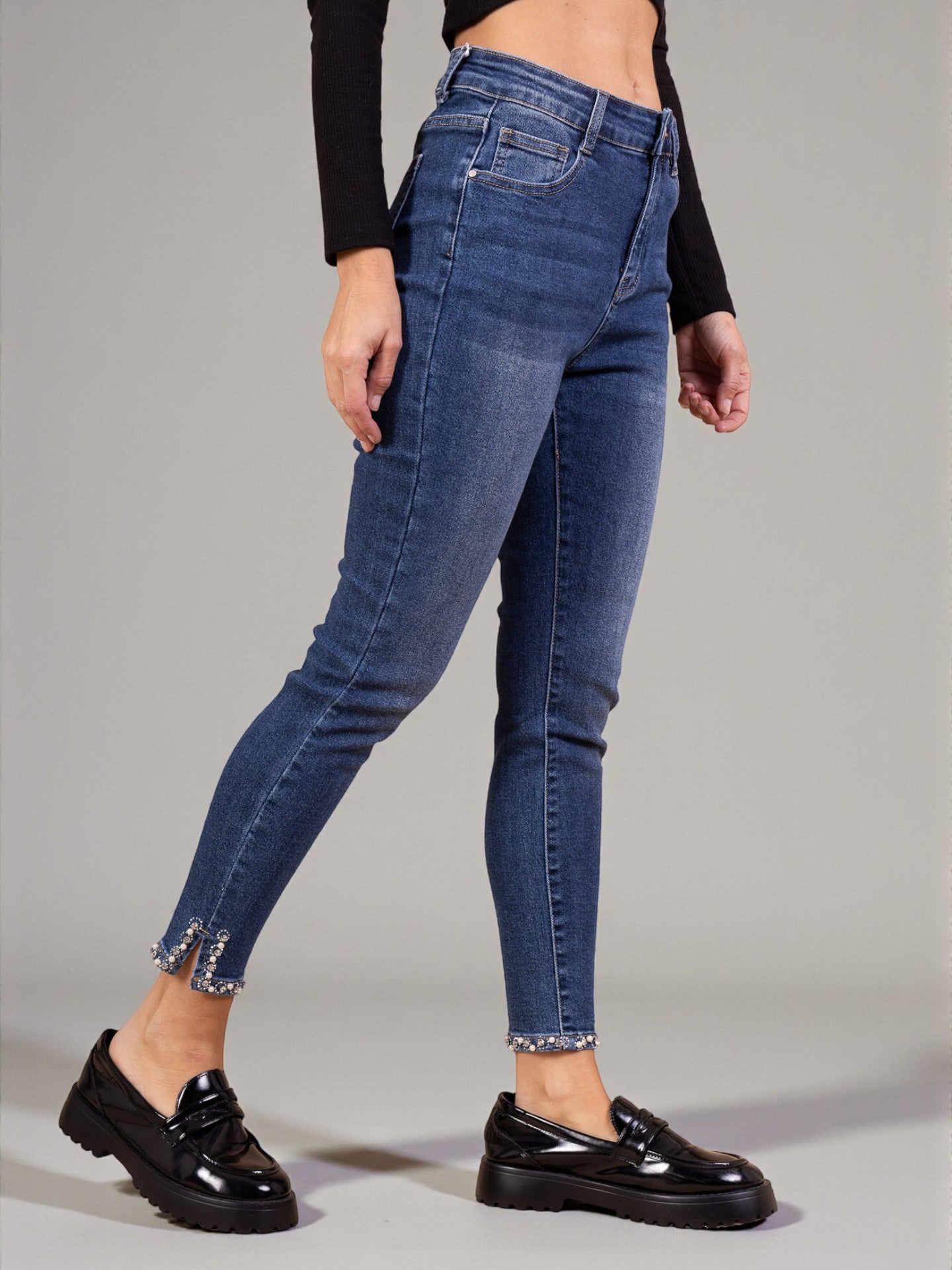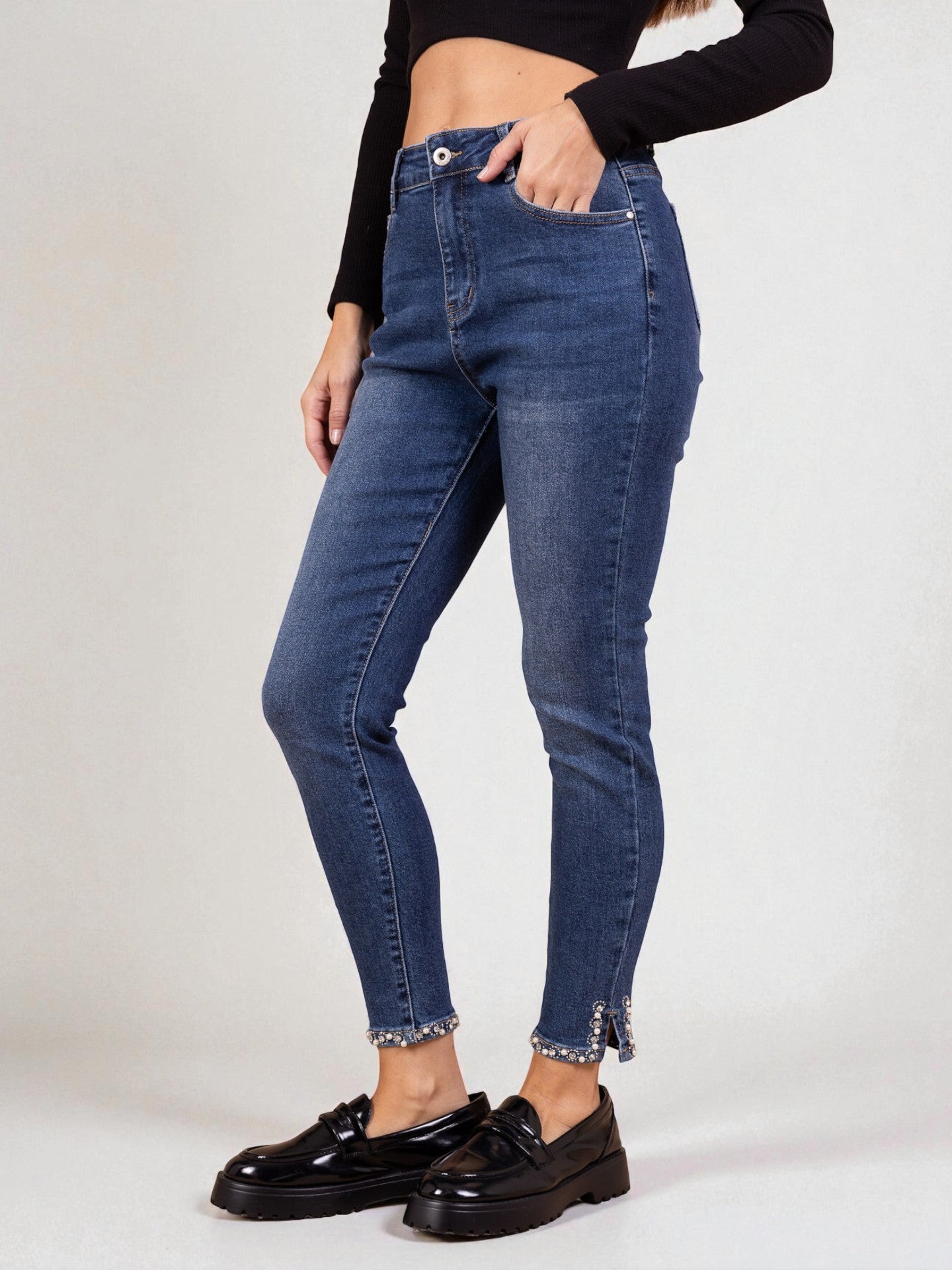 Jeans ajustados en denim elástico de tono azul medio. Corte skinny con tiro medio y detalle de aberturas decoradas con perlas y strass en los bajos. Diseño cómodo y favorecedor que realza la silueta. Perfectos para combinar con blusas o prendas básicas del día a día.
