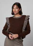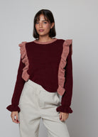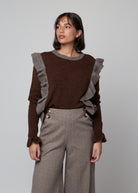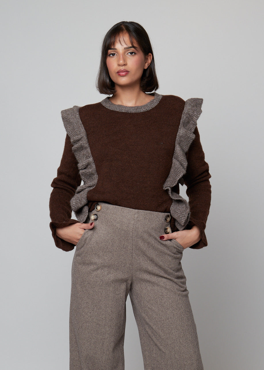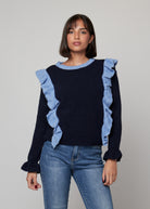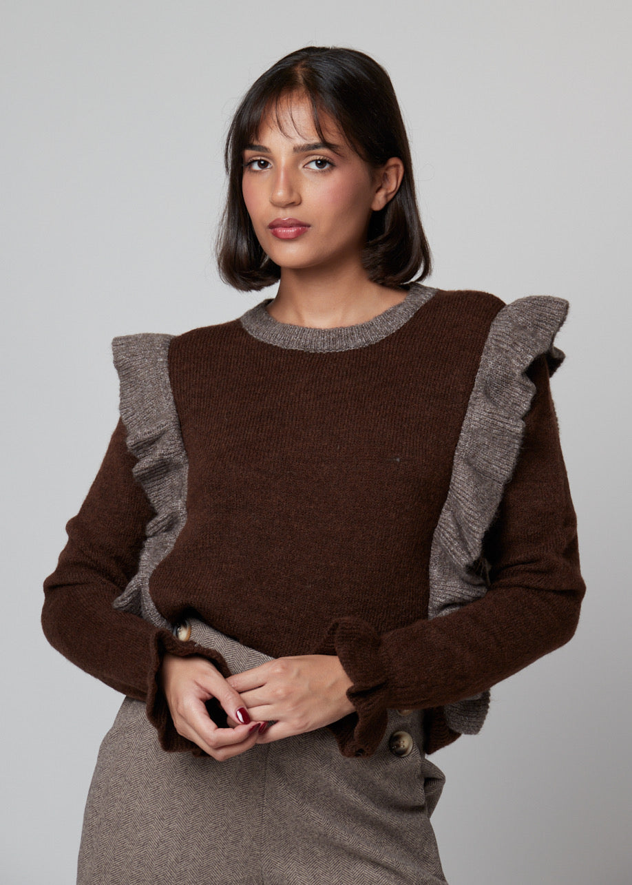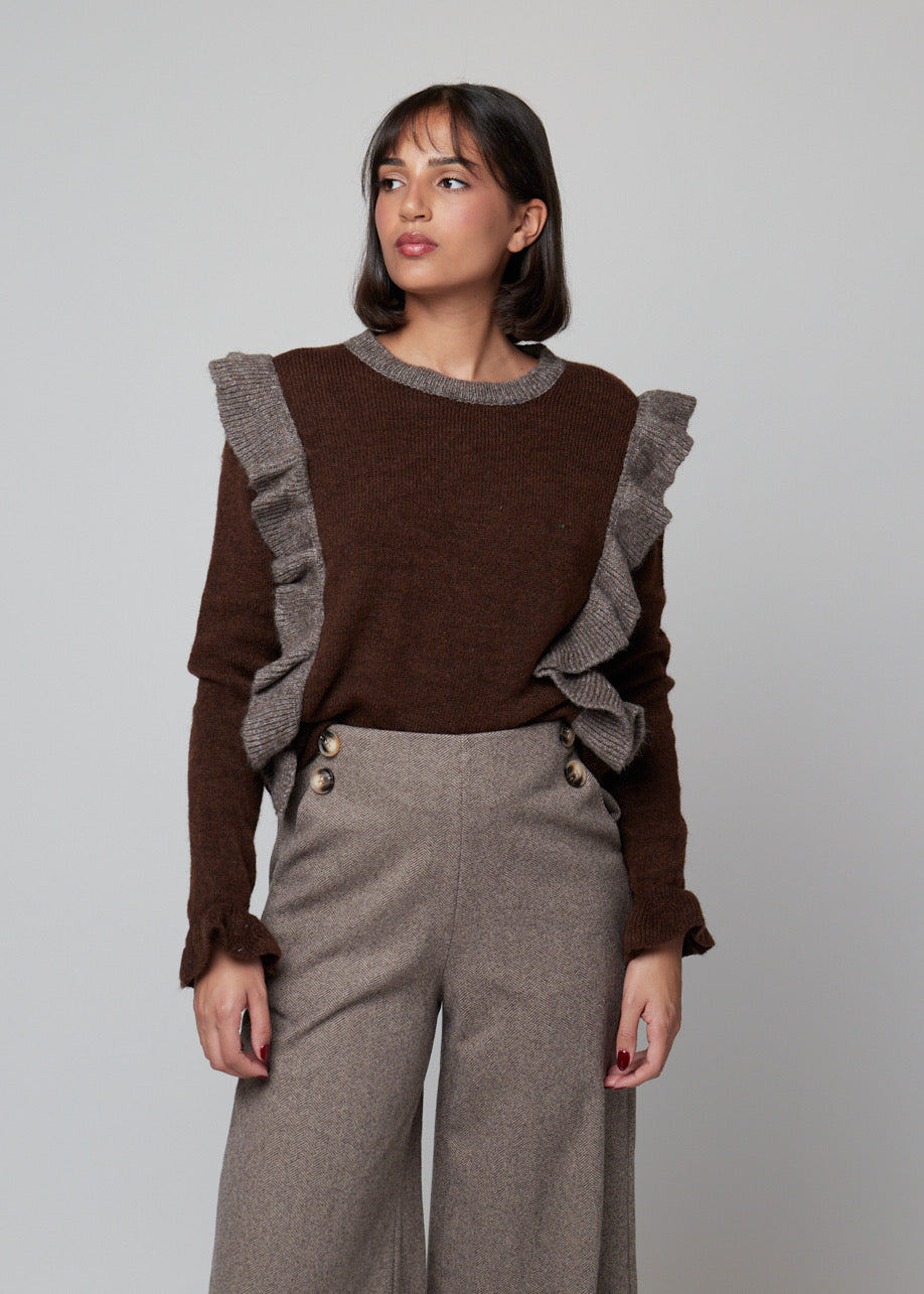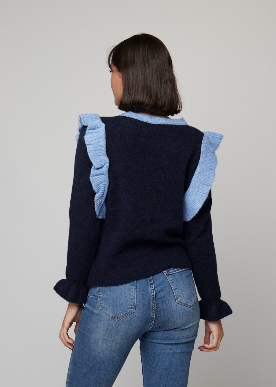 Jersey de punto suave con volantes a contraste en los hombros y cuello redondo. Detalle de volantes también en los puños. Disponible en tres combinaciones de color: azul marino con celeste, burdeos con rosa empolvado y marrón chocolate con gris topo. Corte recto y cómodo, ideal para looks femeninos y casuales.