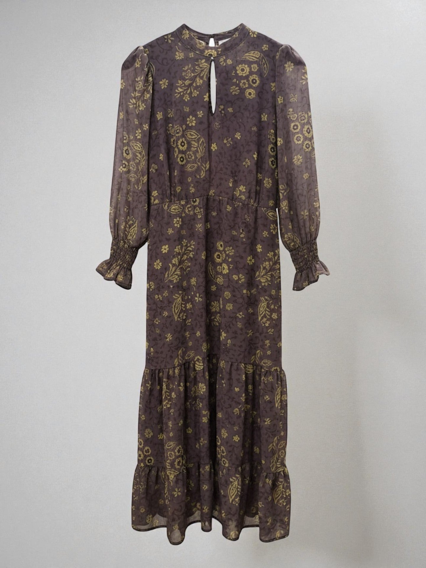 Vestido largo de manga larga con estampado paisley en tonos mostaza sobre fondo marrón. Diseño fluido con cintura ligeramente fruncida, puños elásticos con volante y escote con abertura en lágrima. Ideal para looks boho de otoño o combinaciones casual chic.