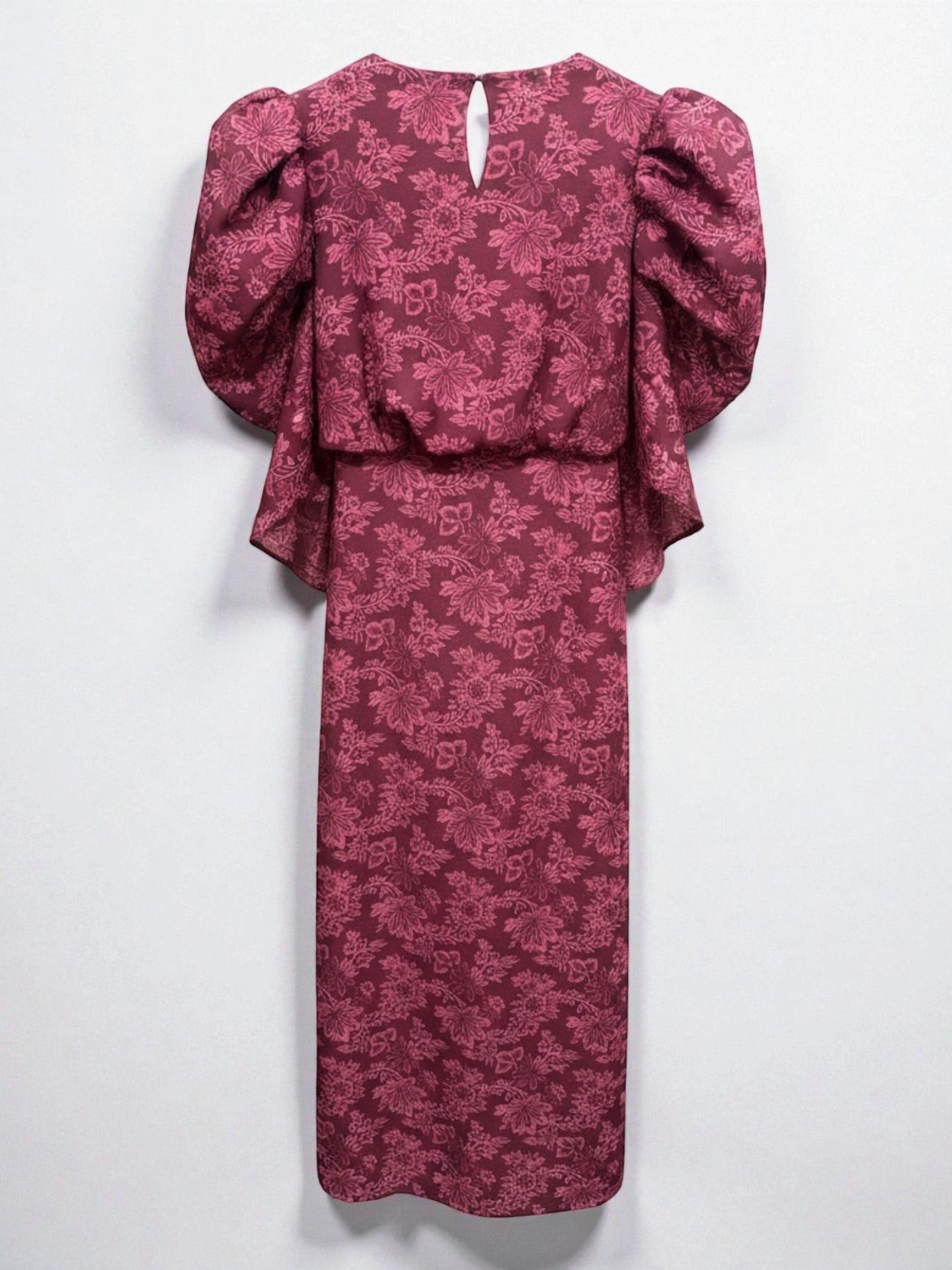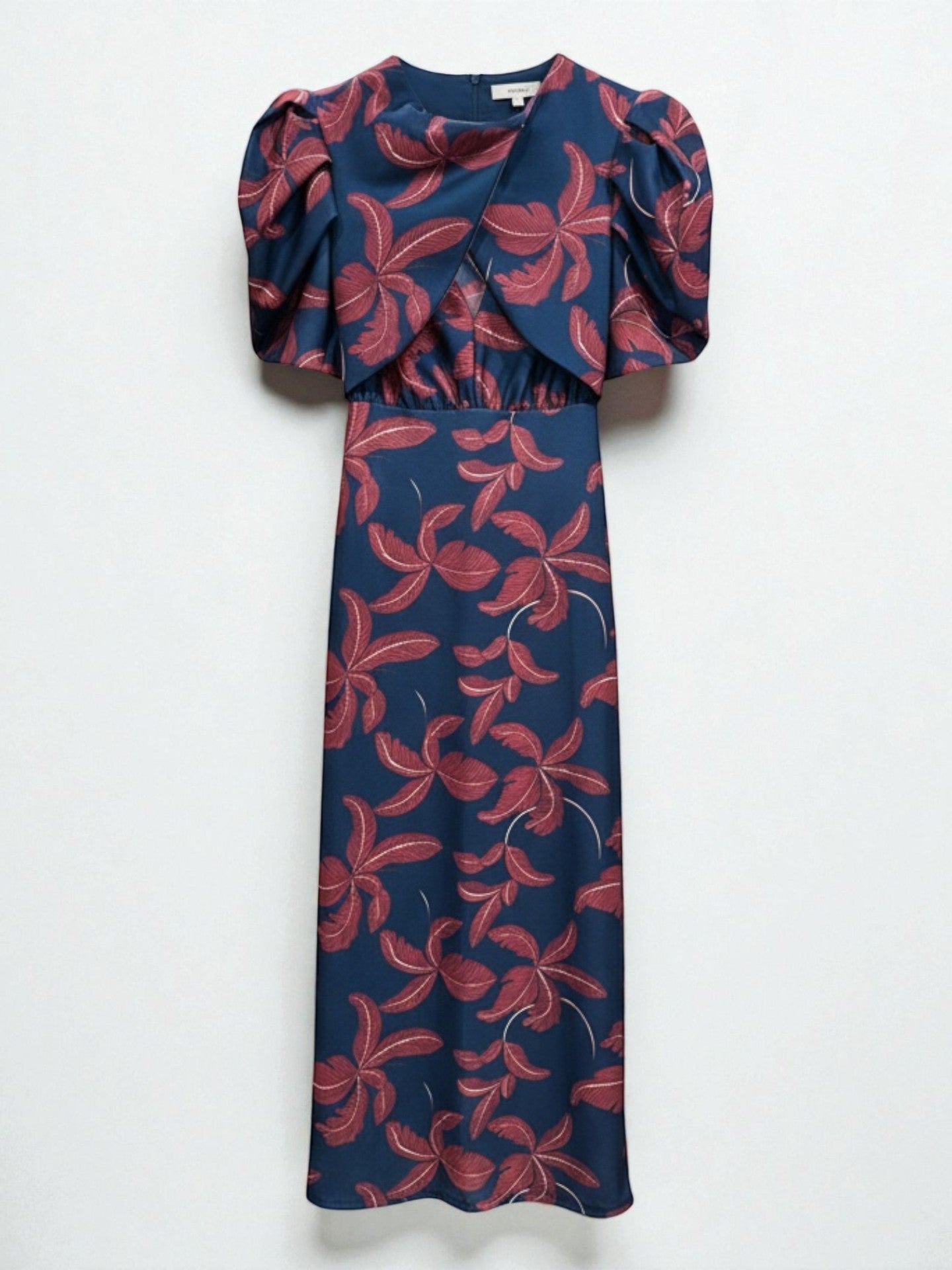 Vestido midi con manga abullonada y estampado vegetal. Diseño estructurado con sobrepecho cruzado, corte entallado en la cintura y cierre trasero con cremallera. Disponible en dos versiones: fondo azul con hojas burdeos o fondo crema con flores burdeos. Ideal para eventos o celebraciones de otoño.