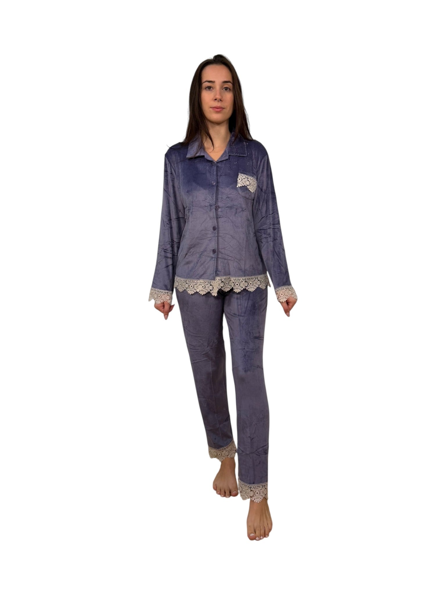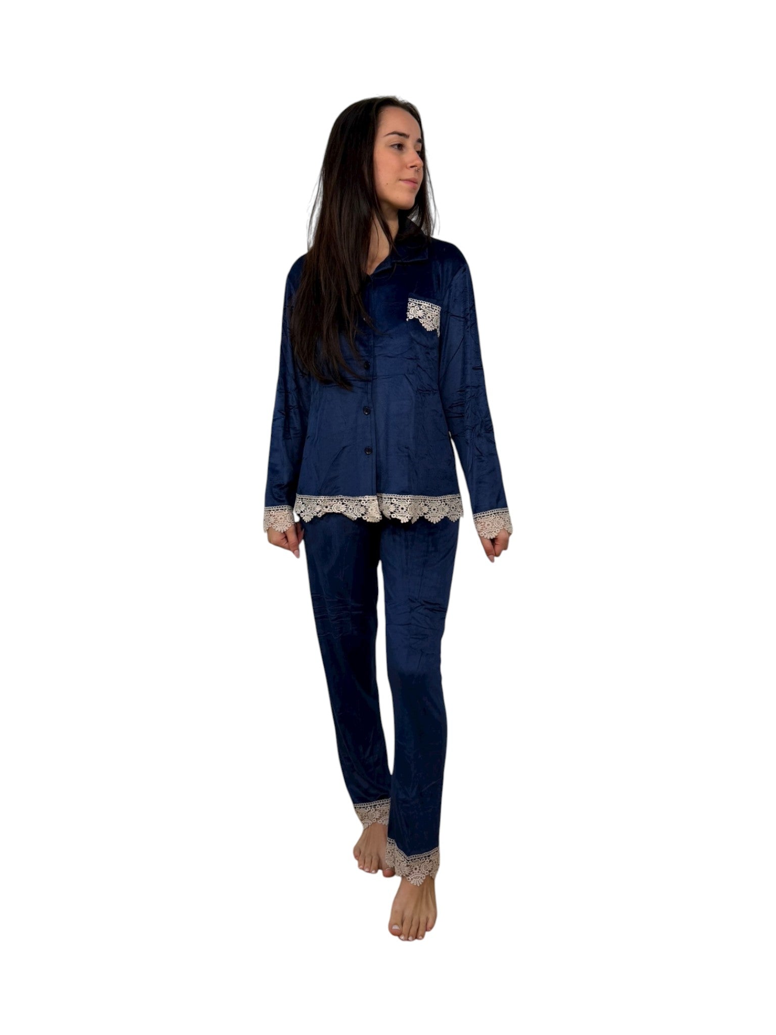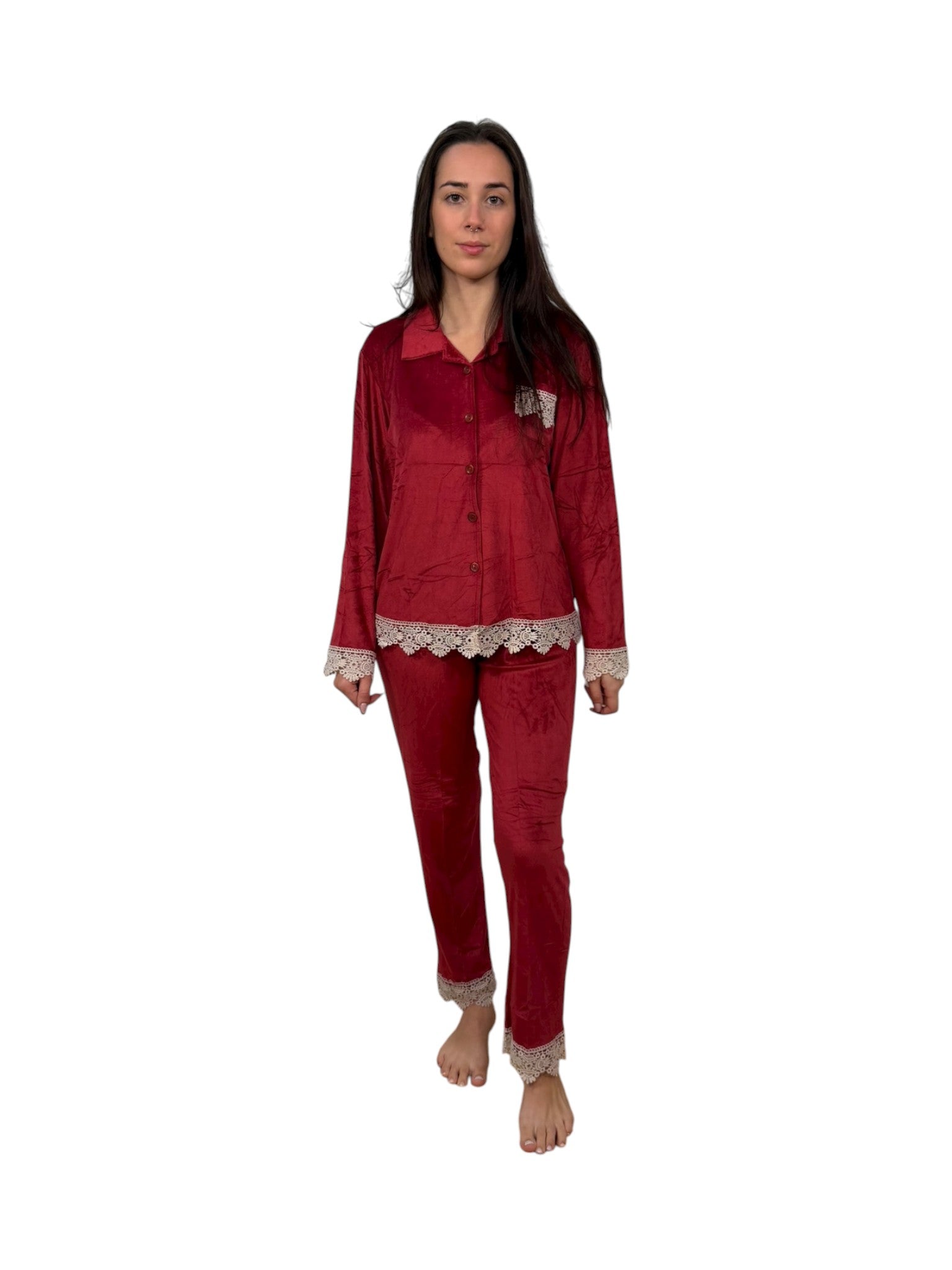 Pijama largo de terciopelo con camisa abotonada, cuello solapa y encaje en puños, bajos y bolsillo. Pantalón a juego con elástico en la cintura y detalle de encaje en el bajo. Suave, elegante y muy cómodo. Disponible en rojo, azul marino y gris perla. Ideal para invierno o para regalar.
