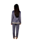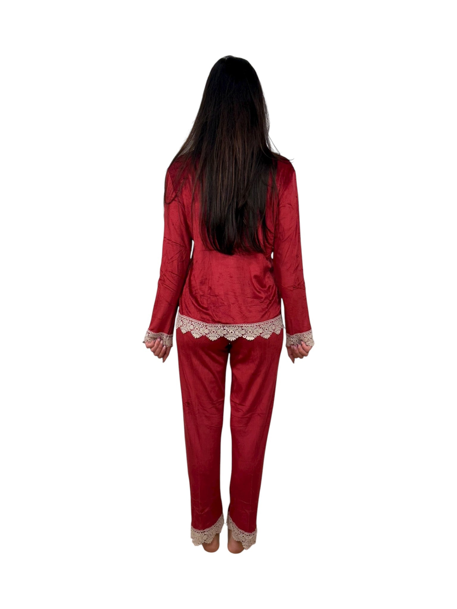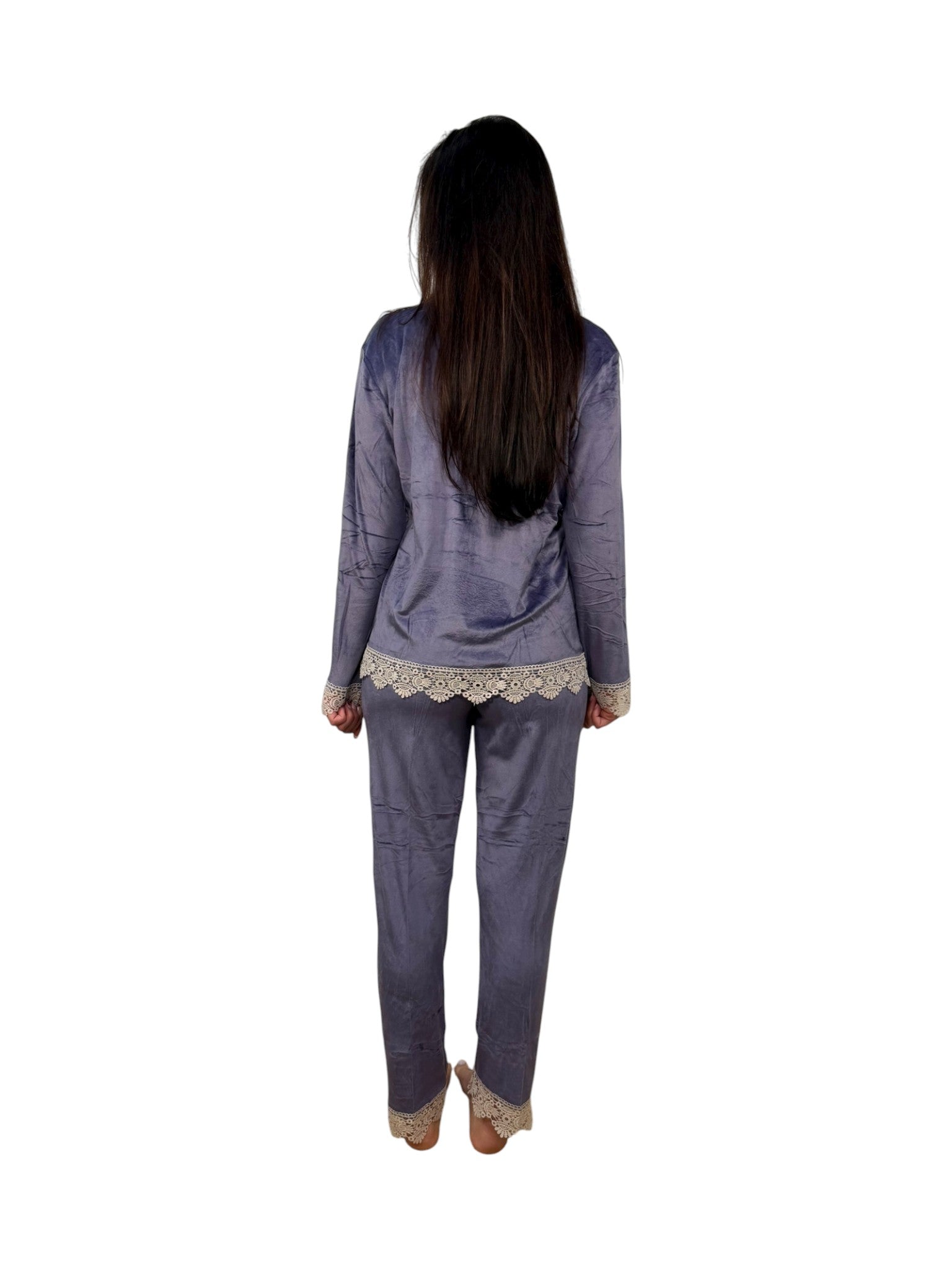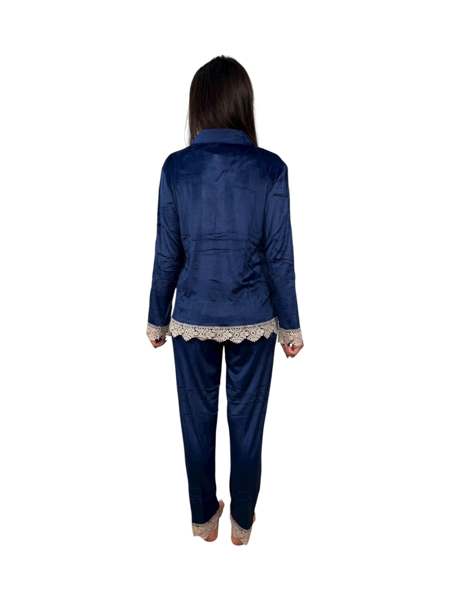 Pijama largo de terciopelo con camisa abotonada, cuello solapa y encaje en puños, bajos y bolsillo. Pantalón a juego con elástico en la cintura y detalle de encaje en el bajo. Suave, elegante y muy cómodo. Disponible en rojo, azul marino y gris perla. Ideal para invierno o para regalar.