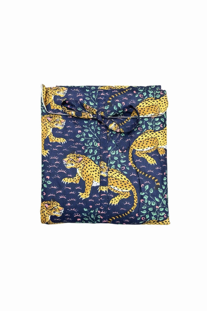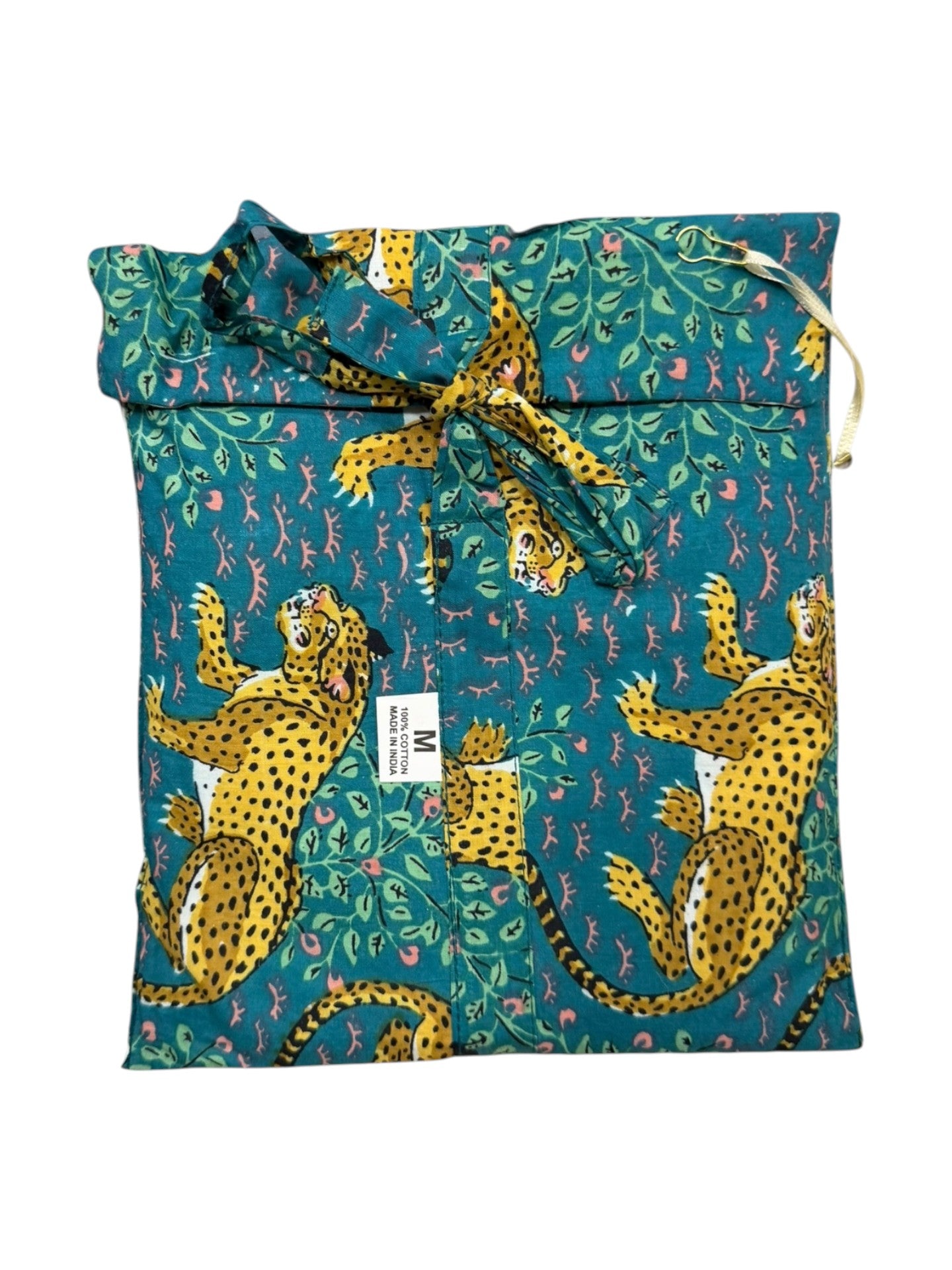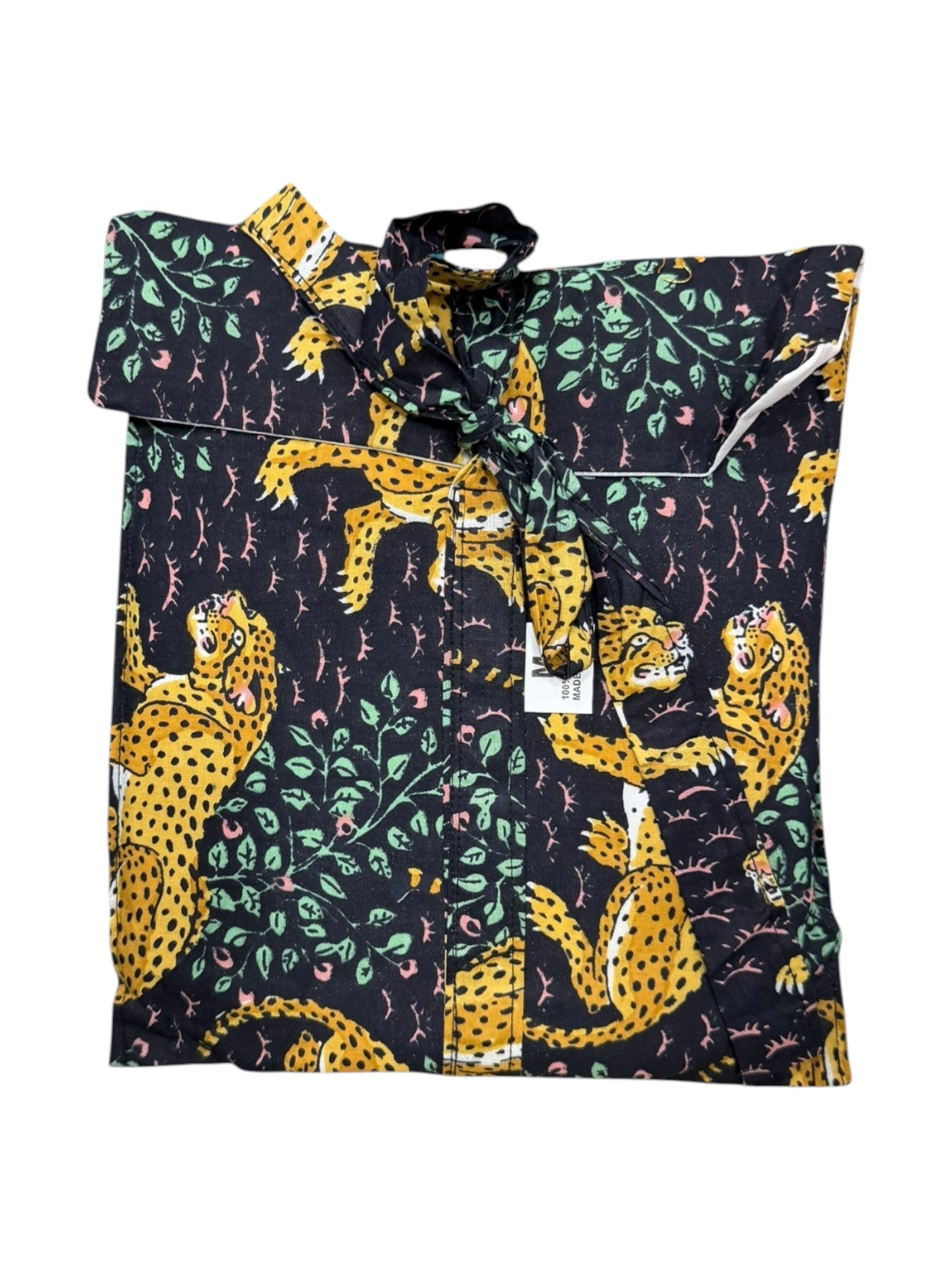 Pijama 100 % algodón con estampado original y pantalón a juego. Suave, cómodo y transpirable, ideal para dormir o estar en casa. Diseño artesanal fabricado en India con estilo boho y acabado de gran calidad.