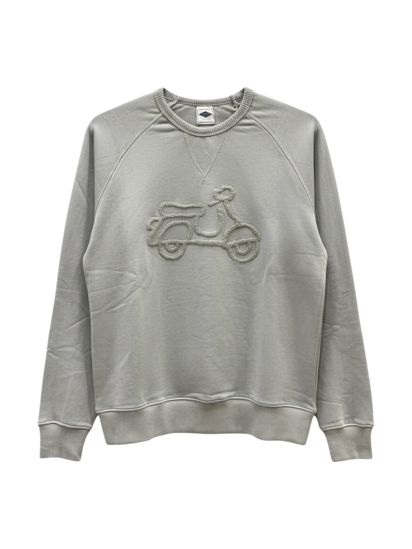 Sudadera gris de algodón con bordado en relieve de moto tipo Vespa. Corte relajado, cuello redondo y acabados elásticos en puños y bajo. Ideal para un look casual con un toque retro y original.