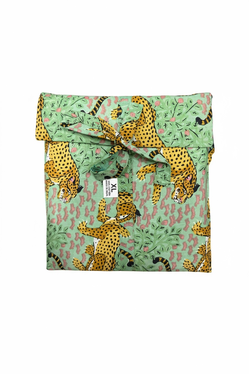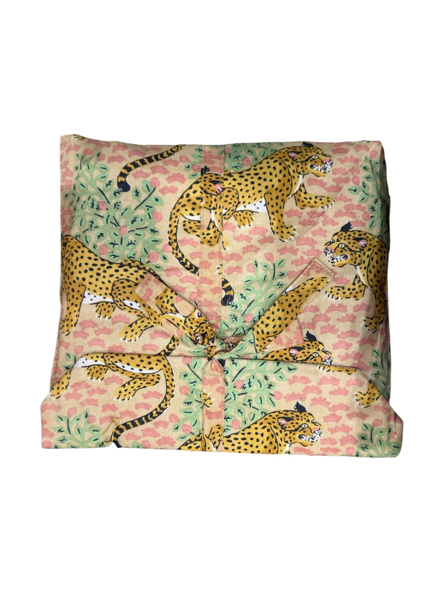 Pijama 100 % algodón con estampado original y pantalón a juego. Suave, cómodo y transpirable, ideal para dormir o estar en casa. Diseño artesanal fabricado en India con estilo boho y acabado de gran calidad.