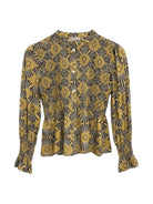 Blusa de algodón con estampado geométrico en tonos mostaza y negro. Corte entallado con frunce en la cintura y cierre frontal con botones. Puños elásticos con pequeño volante y cuello redondeado. Ligera, cómoda y perfecta para combinar con jeans o faldas de estilo boho.
